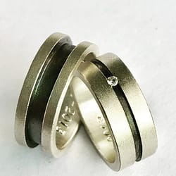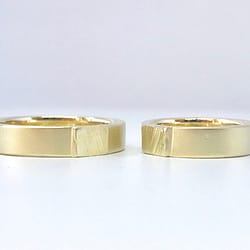 Deze trouwringen zijn in één geheel gegoten. Alleen het zaaggedeelte, dat door het bruidspaar zelf is doorgezaagd, laat nog zien waar ze met elkaar verbonden waren.